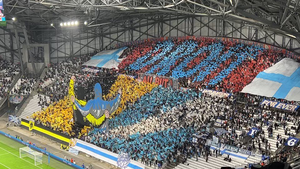 Un tifo à la gloire de l’OM… et de l’AEK est brandi dans zone du Commando Ultra, c’est parti pour #OMAEK ! #Marseille #OM #TeamOM