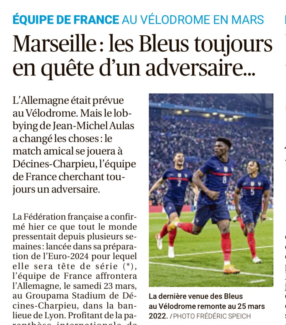 Alors qu’il n’a plus aucune fonction à l’OL, Jean-Michel Aulas continue de faire une fixation sur Marseille en faisant du lobbying pour priver l’Orange Vélodrome, plus beau stade de France, d’un match des Bleus contre l’Allemagne…