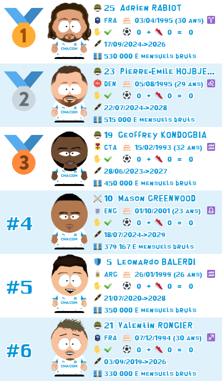Rabiot est à 600 ke. Bien évidemment qu'il y a pleins de facteurs qui entrent en ligne mais ces éléments, nous ne les connaissons pas. Mais cela vaut pour tous les joueurs. Il est donc logique de ne prendre que ce qui est connu, à savoir le salaire brut. On ne sait pas par exemple si Rongier ne touche pas de bonus, pas plus que Kondogbia, etc.