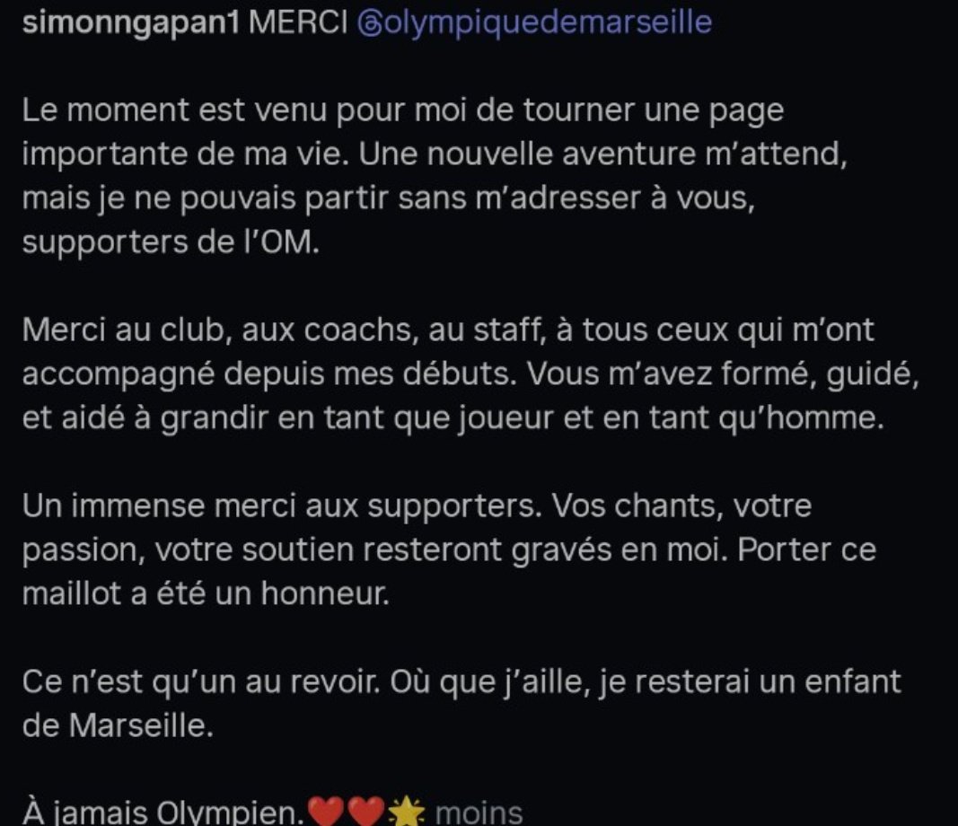 🔹 Simon Ngapandouetnbu 🇨🇲 fait ses adieux à l’OM. Formé au club, il quitte Marseille avec émotion et gratitude 🙏  « Ce n’est qu’un au revoir. Où que j’aille, je resterai un enfant de Marseille. » À jamais Olympien 💙⭐  #TeamOM 🔵⚪ #MercatOM https://t.co/M0rK9O1aBS