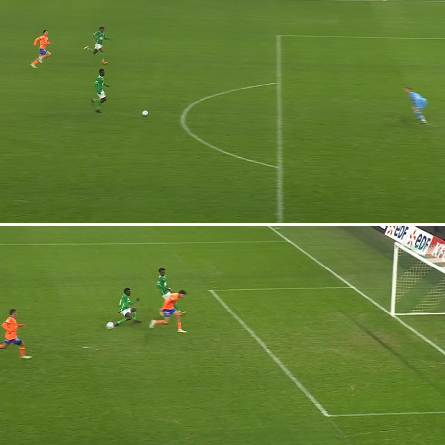 Mais sur cette action bah il met HJ son joueur sur le côté là sauf qu'il y a un gars qui sort de sa moitié de terrain de très loin qui n'est suivi ni par Hojbjerg, ni par Kondogbia, ni par Rongier, Rabiot, l'ailier, qui vous voulez, et tardivement par Merlin qui lui finit carrément par ralentir sa course tandis que Balerdi court à fond jusqu'au bout...