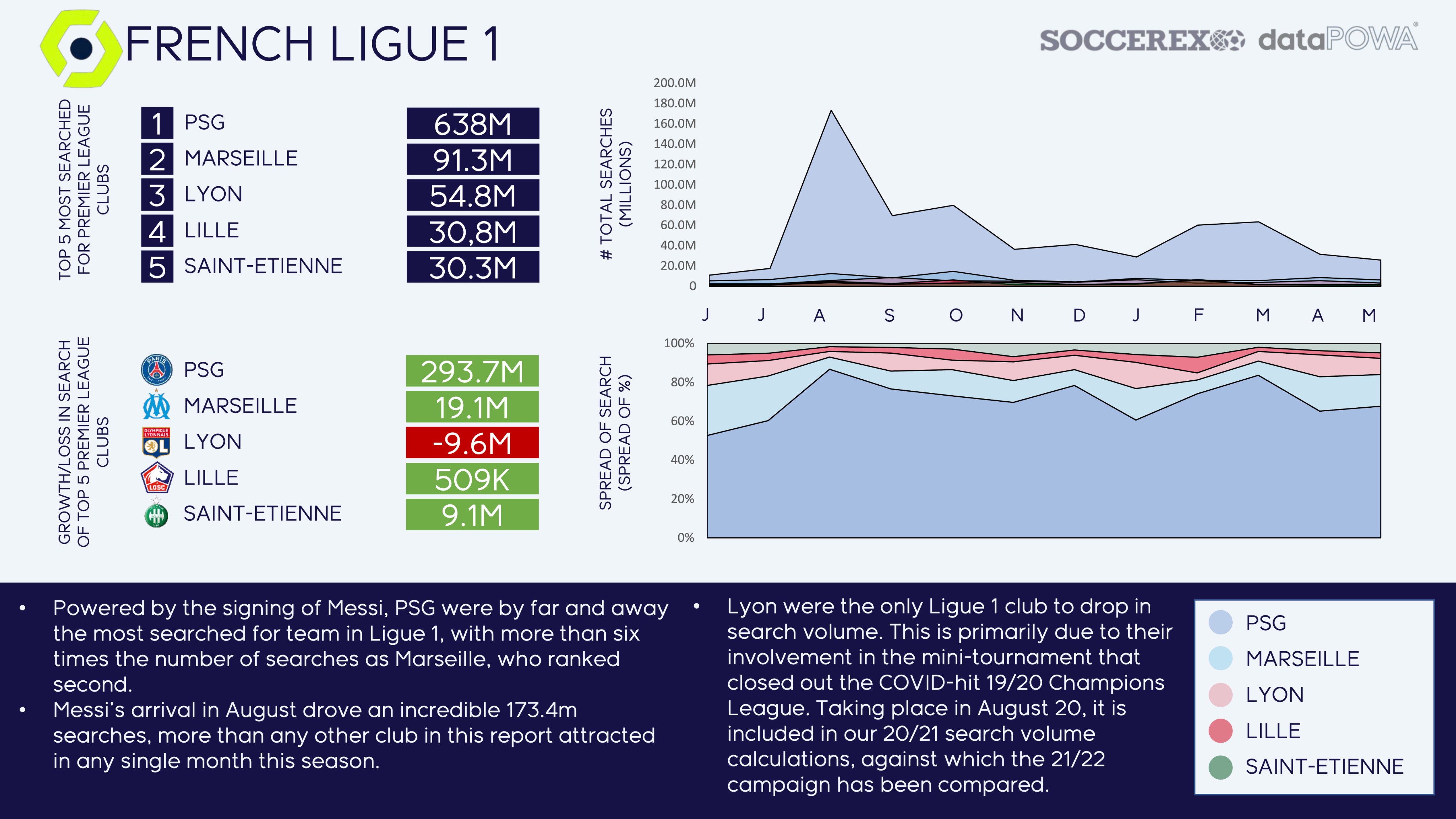 Les clubs de L1 les plus recherchés en 2021-2022 sur les réseaux sociaux, les moteurs de recherche ainsi que les interactions des supporters à travers le monde entier :