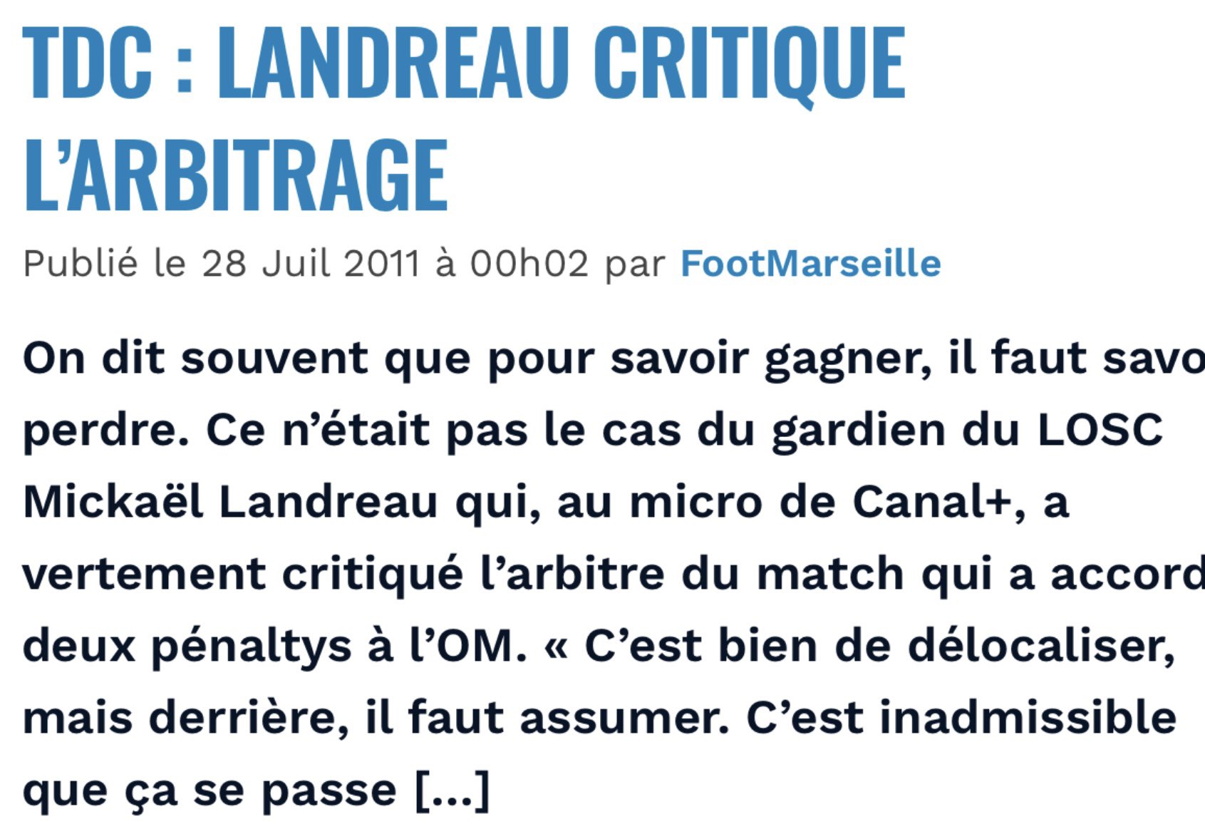 On dit souvent que pour savoir gagner, il faut savoir perdre. Ce n’était pas le cas du gardien du LOSC Mickaël Landreau qui, au micro de Canal+, a vertement critiqué l’arbitre du match qui a accordé deux pénaltys à l’OM. « C’est bien de délocaliser, mais derrière, il faut assumer. C’est inadmissible que ça se passe […]