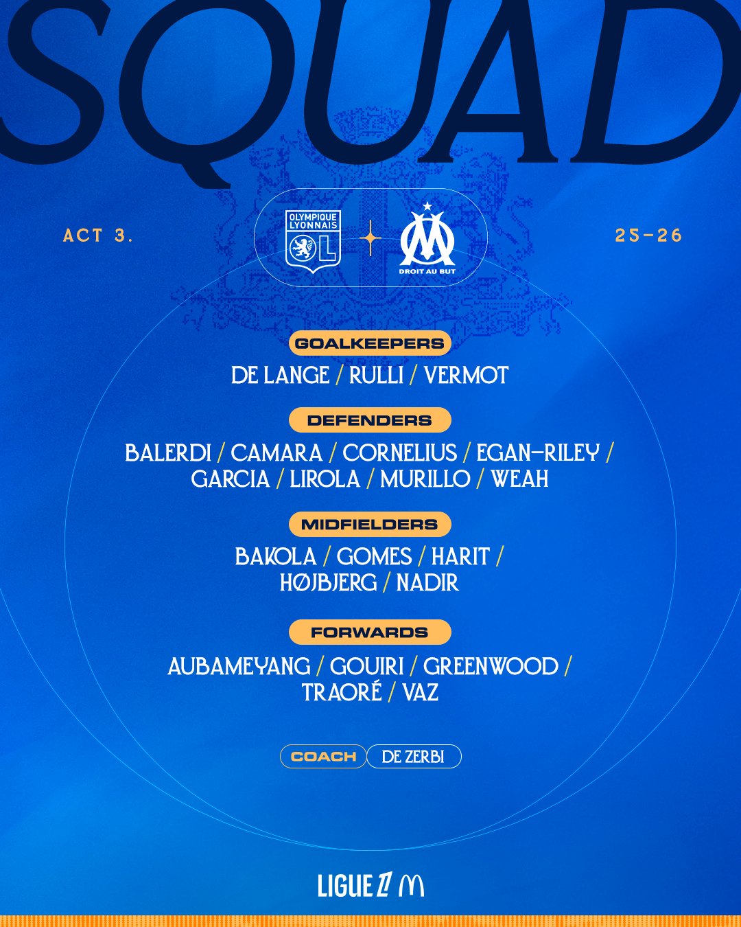 Descamps - Maitland-Niles, Mata, Niakhaté, Abner - Tessmann, Morton - Merah, Tolisso, Fofana - Karabec