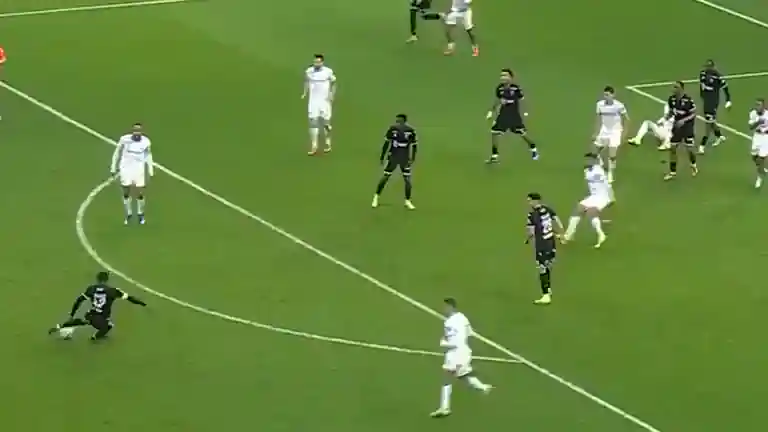 90e+ 1 minute : le joueur lyonnais n°23 effectue une passe vers son coéquipier n°9, puis il poursuit sa course et entre en contact avec le joueur marseillais n°33. L’arbitre laisse le jeu se poursuivre. Le ballon est récupéré par l’équipe marseillaise qui conclut son attaque par un but. L’arbitre vidéo vérifie l’intégralité de la phase et confirme la validation du but.